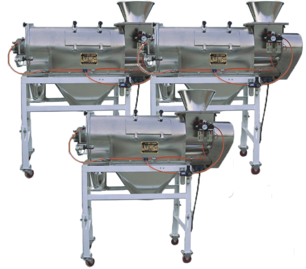 本設備篩網(wǎng)為圓筒狀,置于機體內(nèi),物料通過螺旋輸送系統(tǒng)后,和氣流混合,霧化進入網(wǎng)筒內(nèi),通過網(wǎng)筒內(nèi)風輪葉片使物料同時受離心力和旋風推進力,從而迫使物料噴射過網(wǎng),由細料排出口排出,不能過網(wǎng)的物料沿筒壁從粗料口排出。